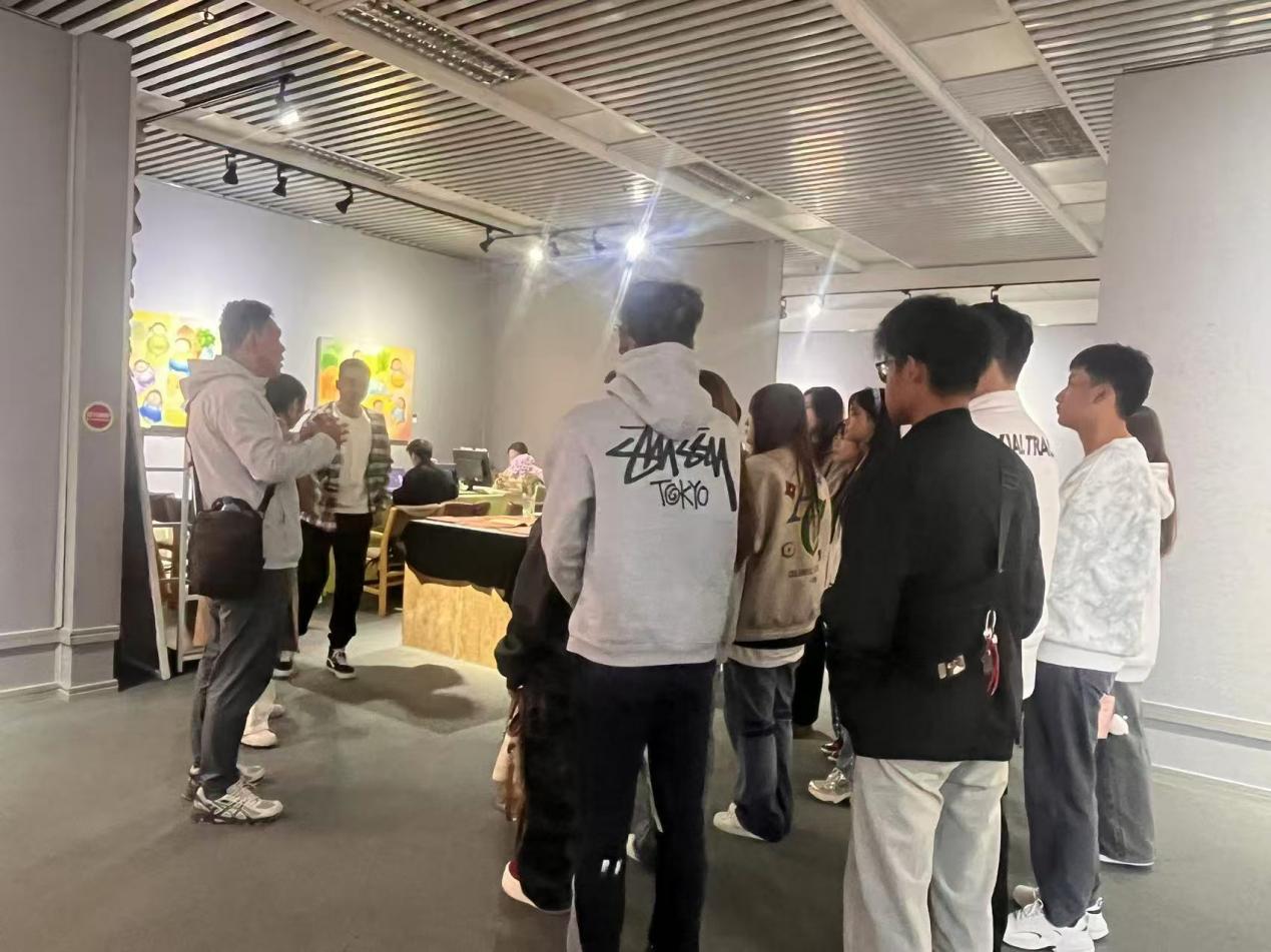 在潘德海画展现场,讲解员从创作背景、艺术手法、情感思想及艺术史意义四个维度,为学生深入解读作品。学生们围坐倾听,主动提出色彩搭配、“胖娃”寓意等疑问,现场交流氛围热烈,思想的火花在师生间不断碰撞,有利于提升学生艺术鉴赏能力。