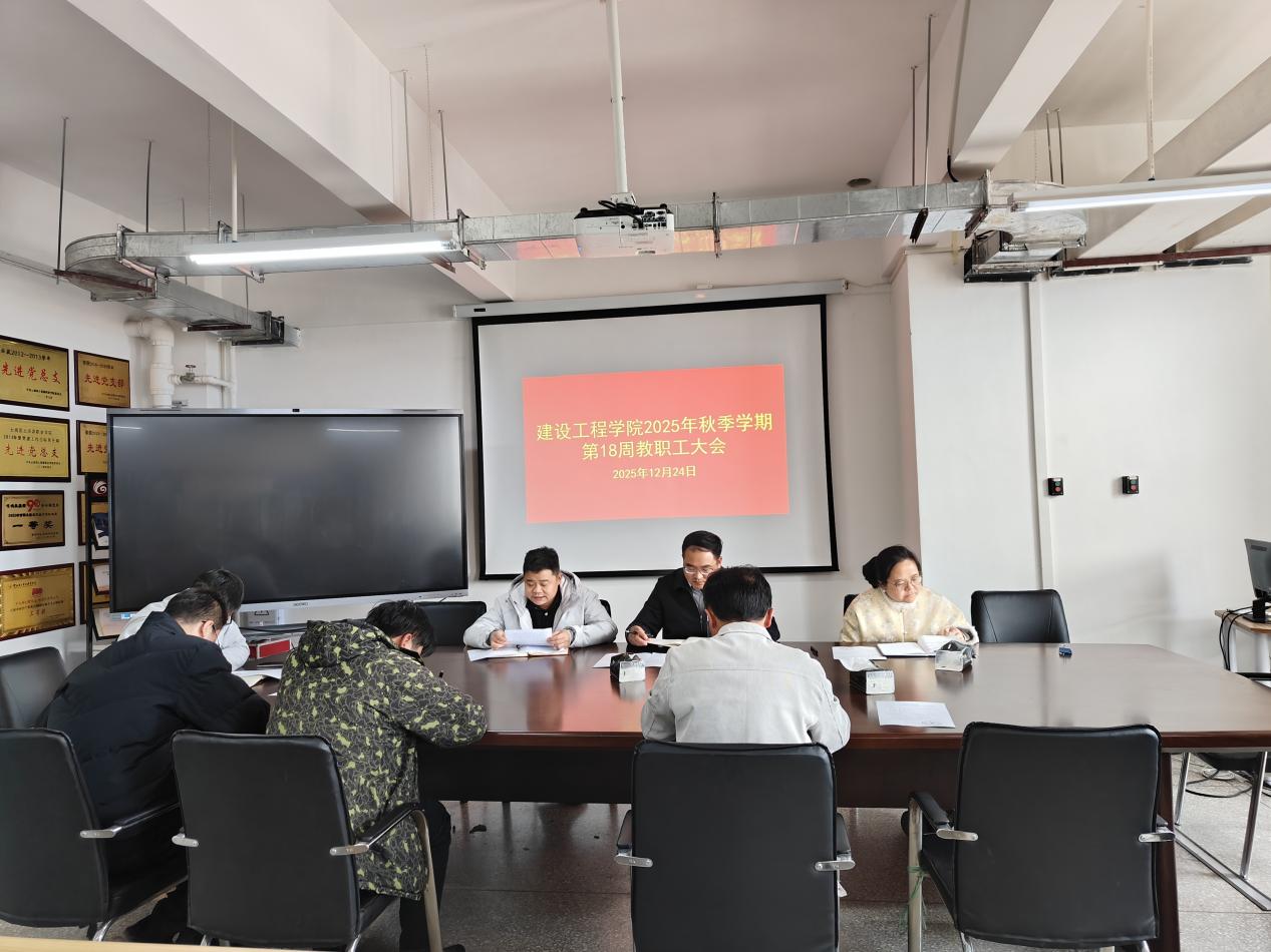 2025年12月24日,建设工程学院在明尚楼C301会议室召开2025年秋季学期第18周教职工大会。会议由学院党委书记李洪香主持,全体教职工参加。